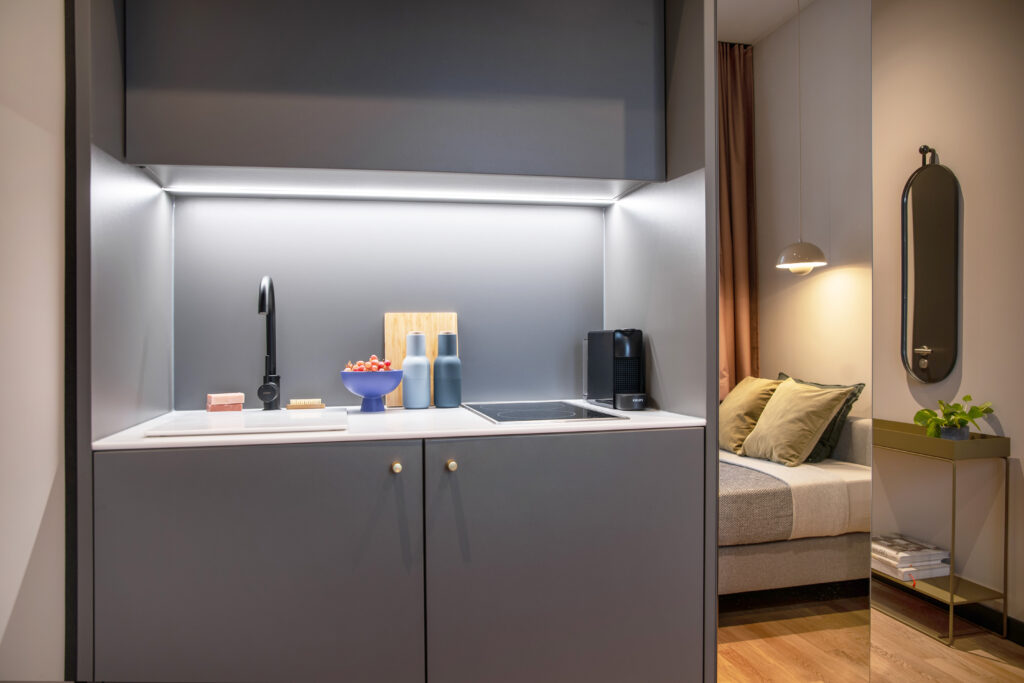 Klein, aber oho: Das ipartment Xtra Smart bietet dir alle wichtigen Funktionen für einen komfortablen Aufenthalt. Es ist ideal für Alleinreisende, die Wert auf ein optimales Preis-Leistungs-Verhältnis legen. Maßgefertigte Designerküche, 140 cm Boxspring-Bett, Arbeitsbereich sind gekonnt integriert.