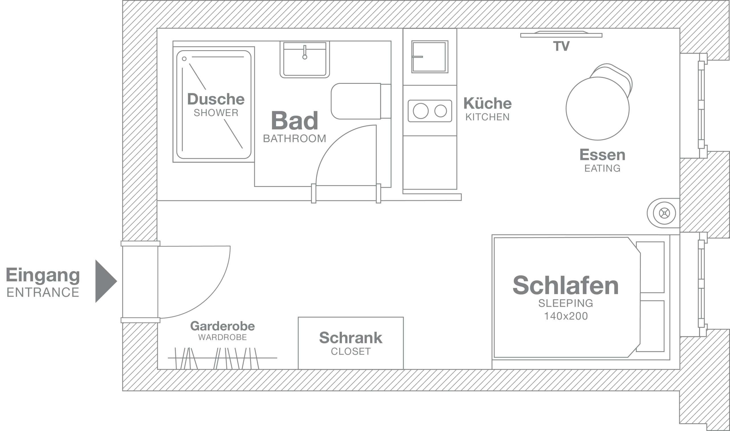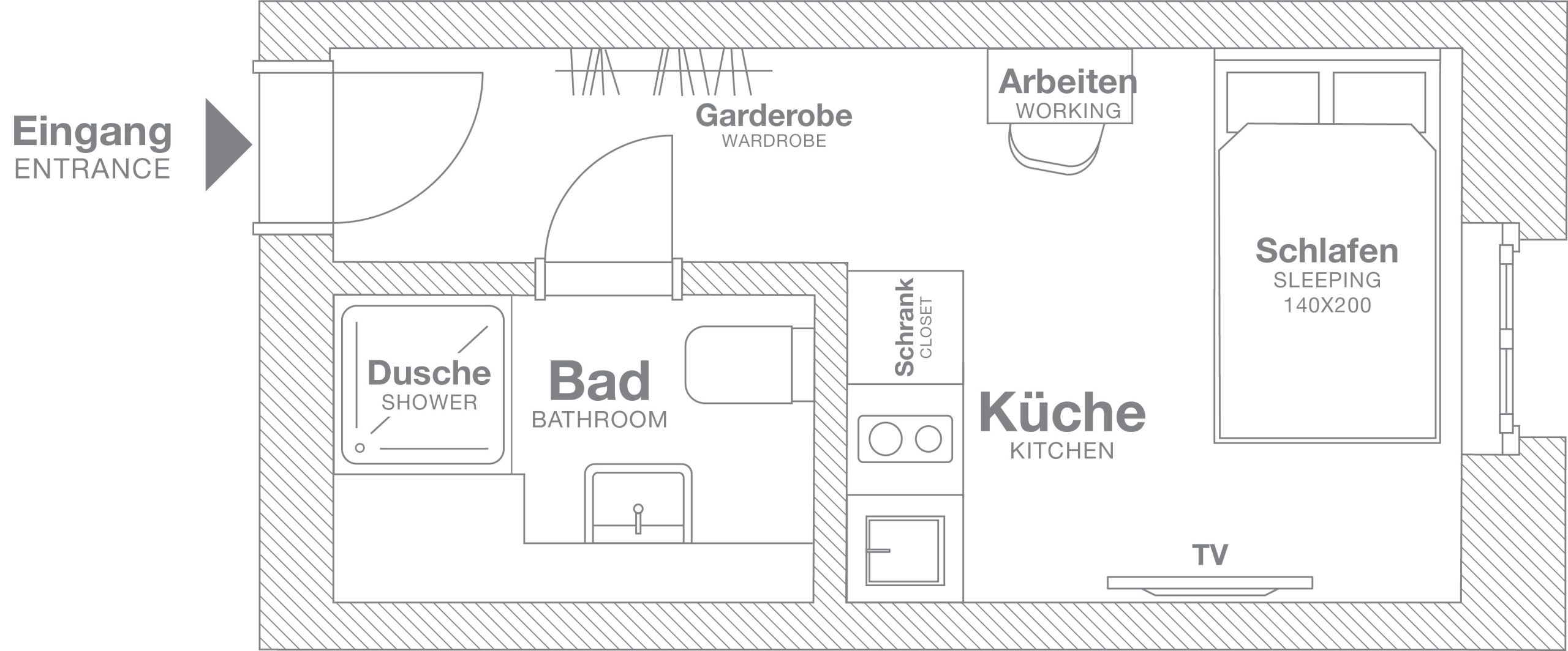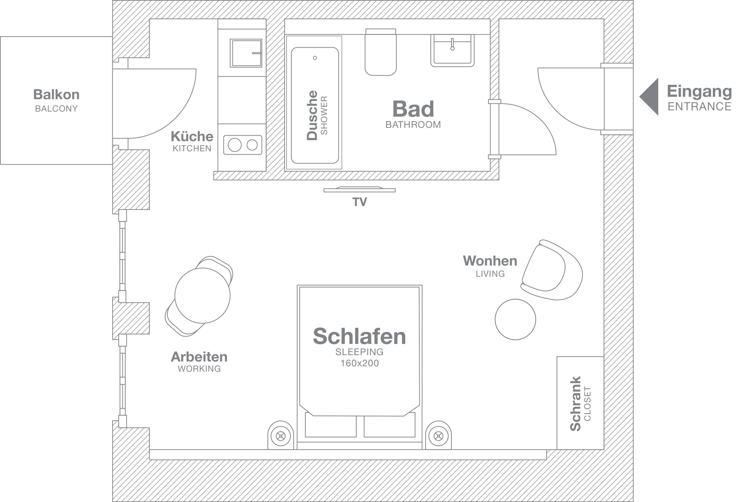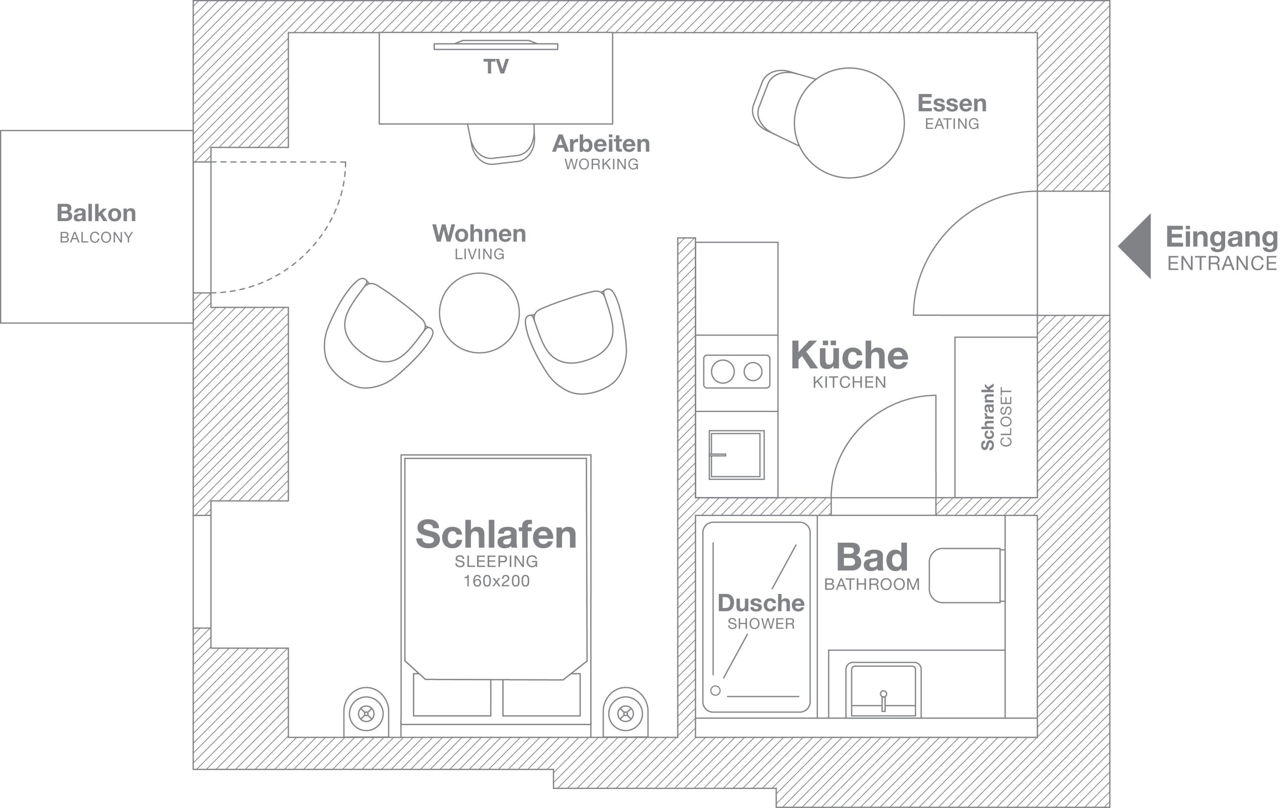 Klein, aber oho: Das ipartment Xtra Smart+ bietet dir alle wichtigen Funktionen für einen komfortablen Aufenthalt. Es ist ideal für Alleinreisende, die Wert auf ein optimales Preis-Leistungs-Verhältnis legen. Maßgefertigte Designerküche, 140 cm Boxspring-Bett, Arbeitsbereich sind gekonnt integriert. Die Xtra Smart+ Kategorie ist zusätzlich mit einem Balkon ausgestattet.