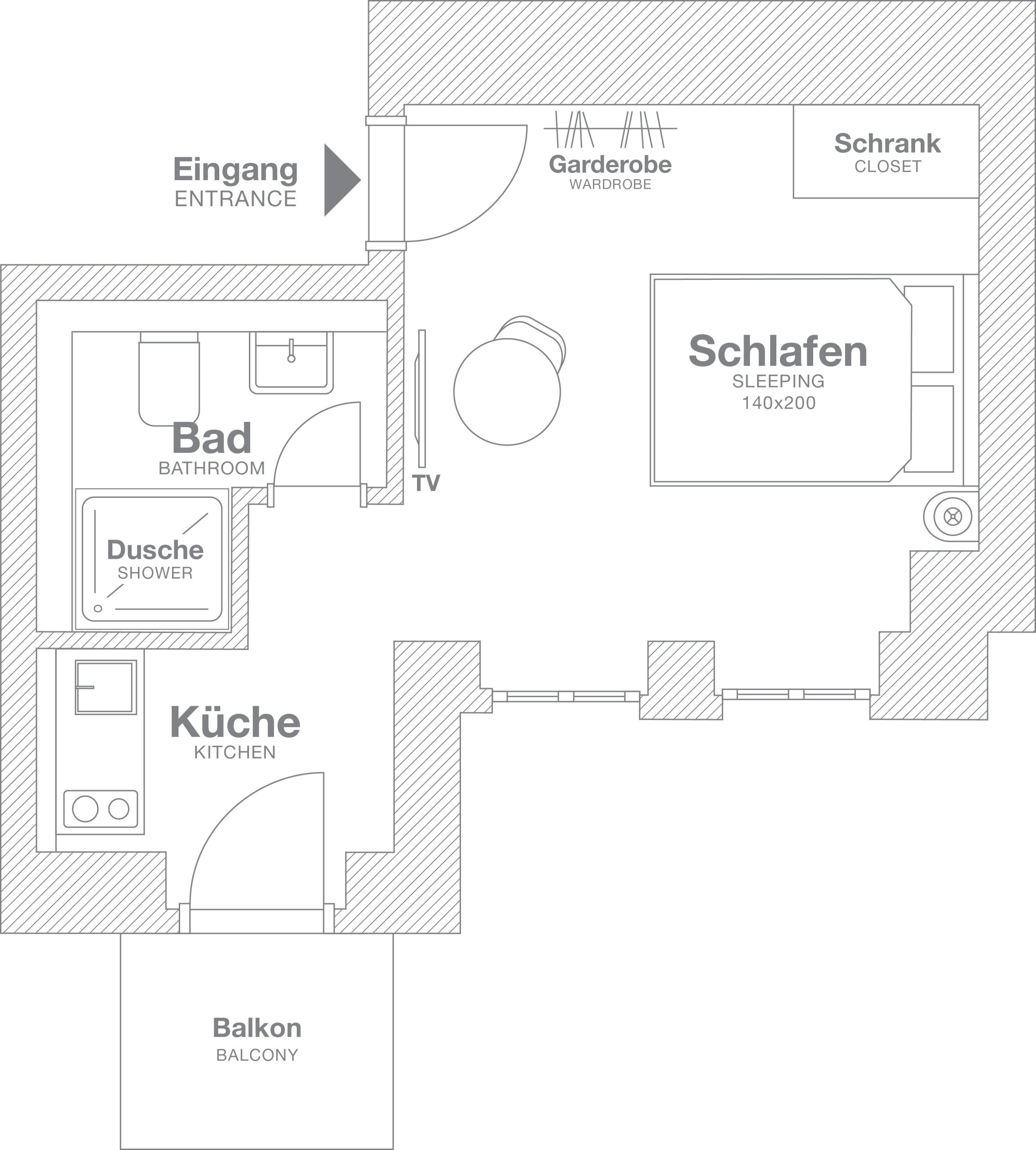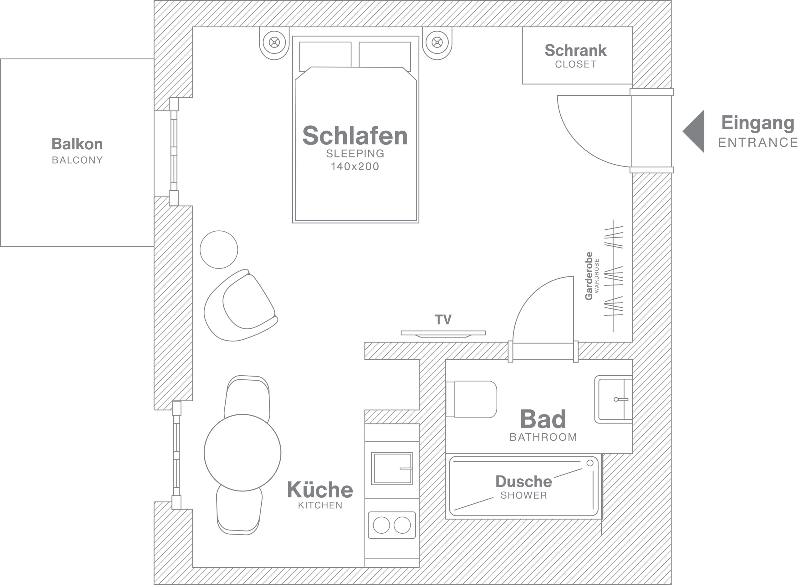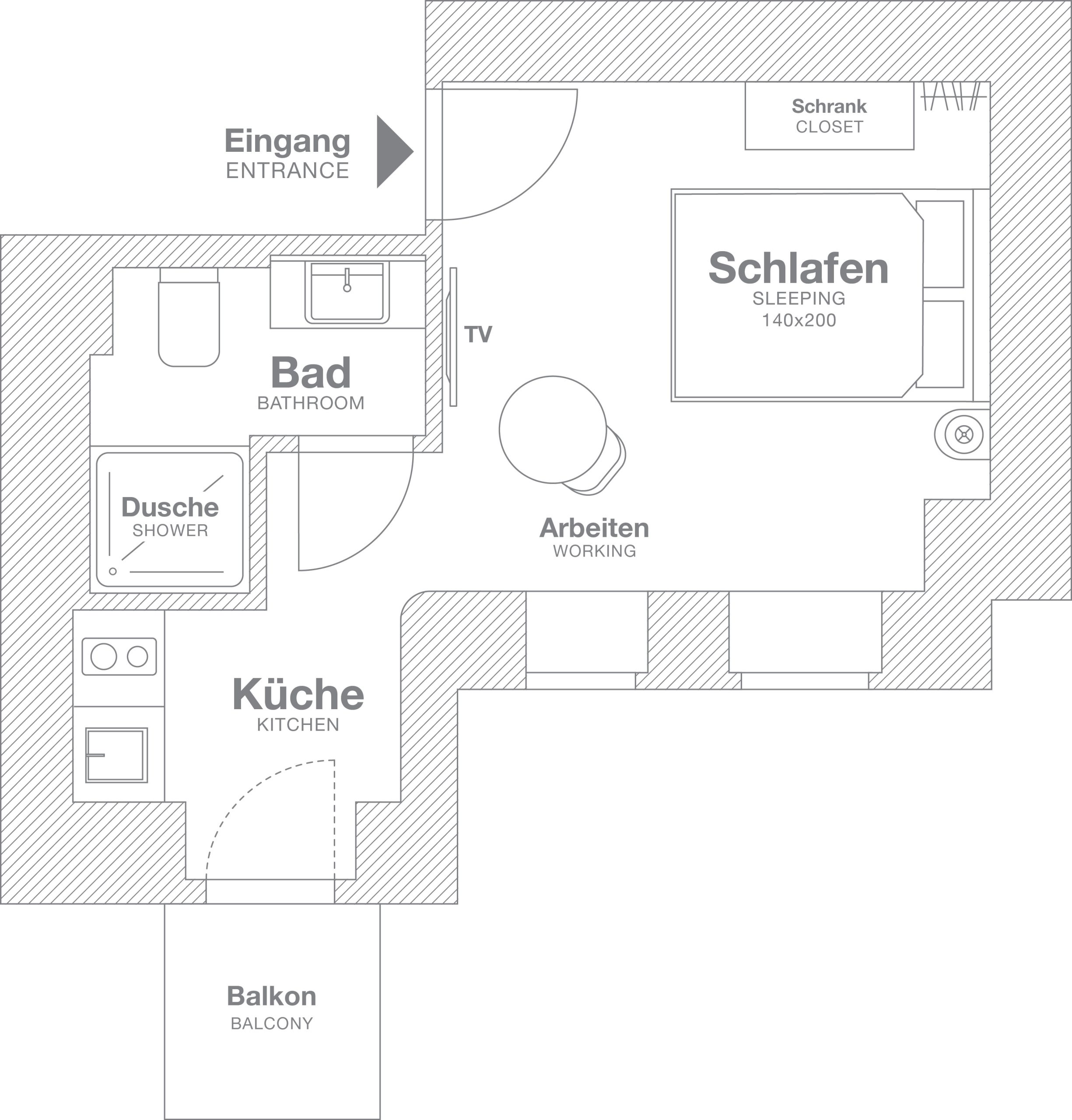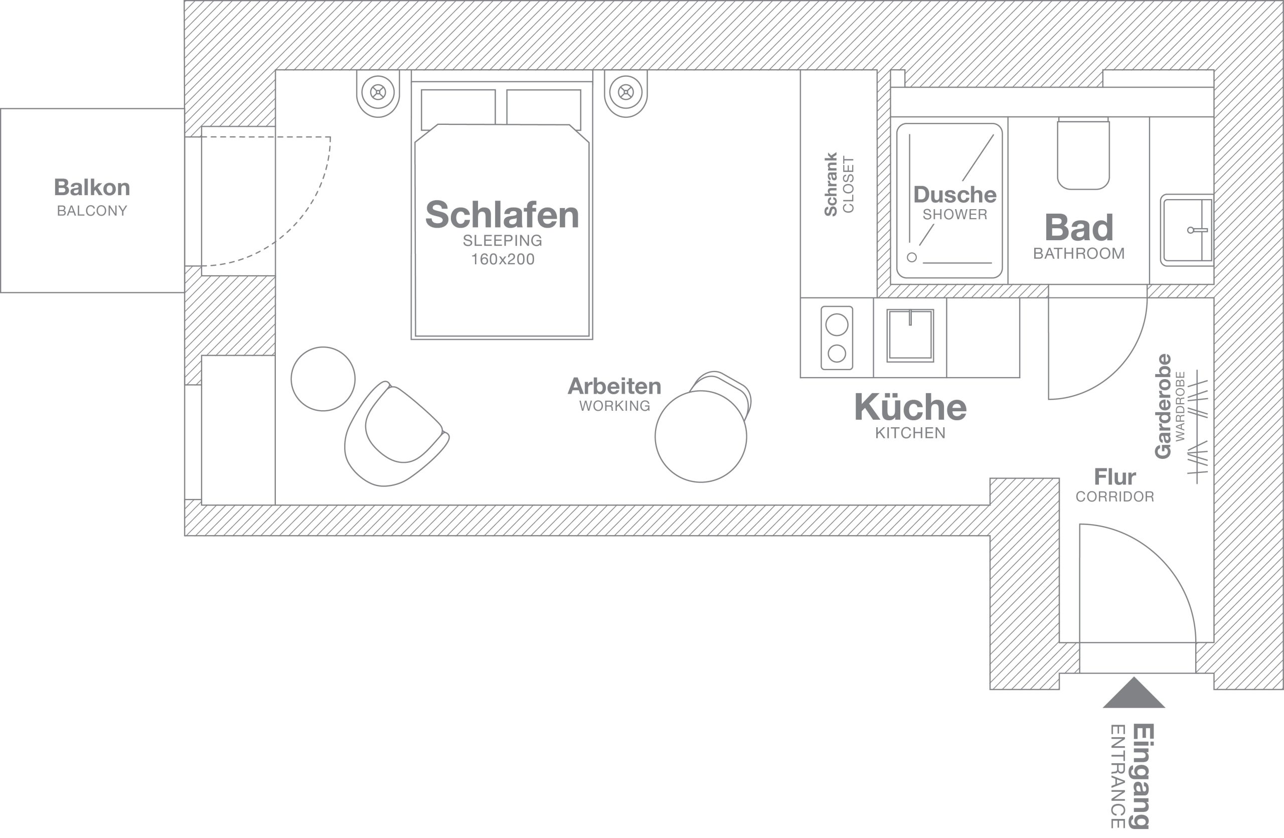 Klein, aber oho: Das ipartment Xtra Smart+ bietet dir alle wichtigen Funktionen für einen komfortablen Aufenthalt. Es ist ideal für Alleinreisende, die Wert auf ein optimales Preis-Leistungs-Verhältnis legen. Maßgefertigte Designerküche, 140 cm Boxspring-Bett, Arbeitsbereich sind gekonnt integriert. Die Xtra Smart+ Kategorie ist zusätzlich mit einem Balkon ausgestattet.