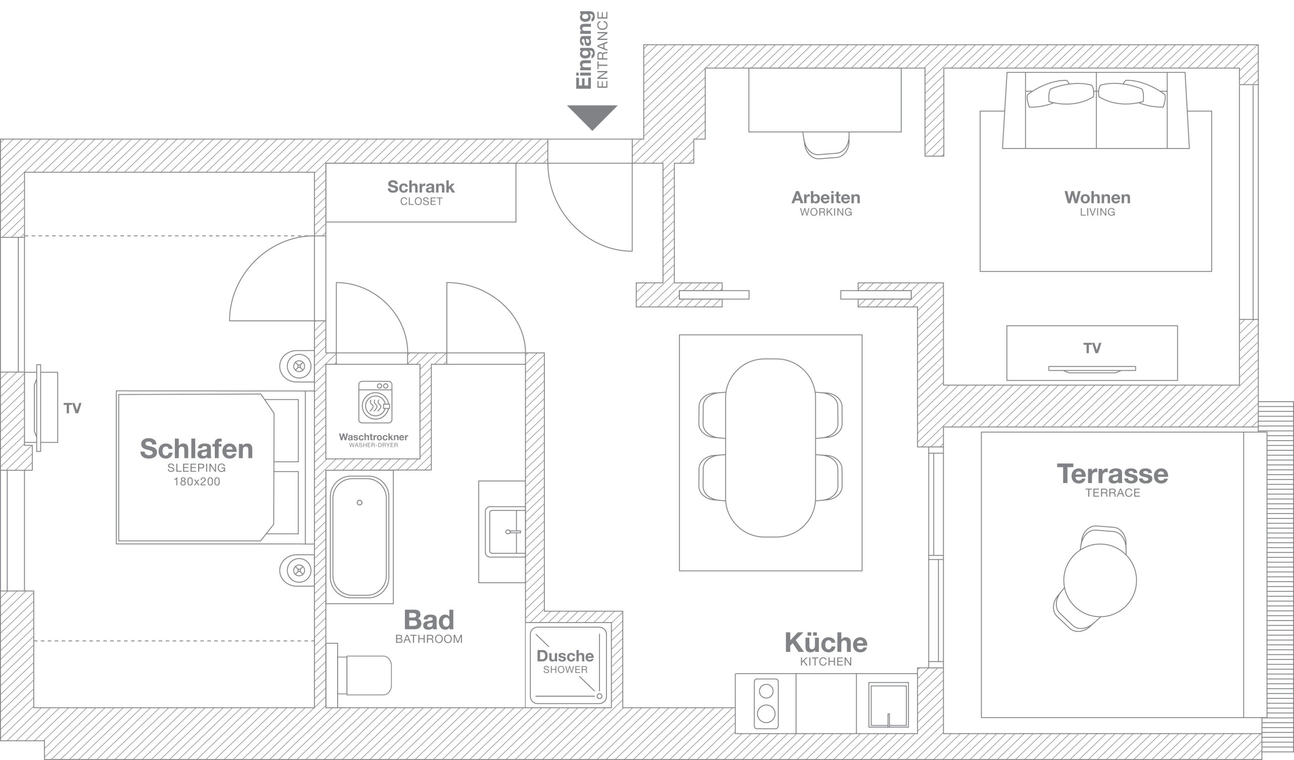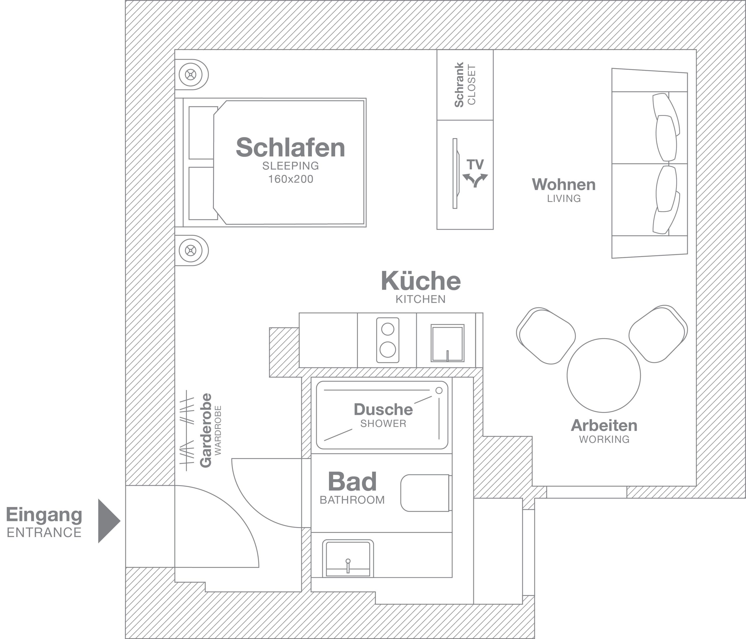 Raum zur freien Entfaltung: Die Bereiche Wohnen, Arbeiten, Kochen und Essen sind gekonnt geplant. Der Schlafbereich ist mit einem komfortablen 180 cm Doppelbett ausgestattet. Ganz besonders macht das ipartment die – von der Küche zugängliche – Sonnenterrasse.