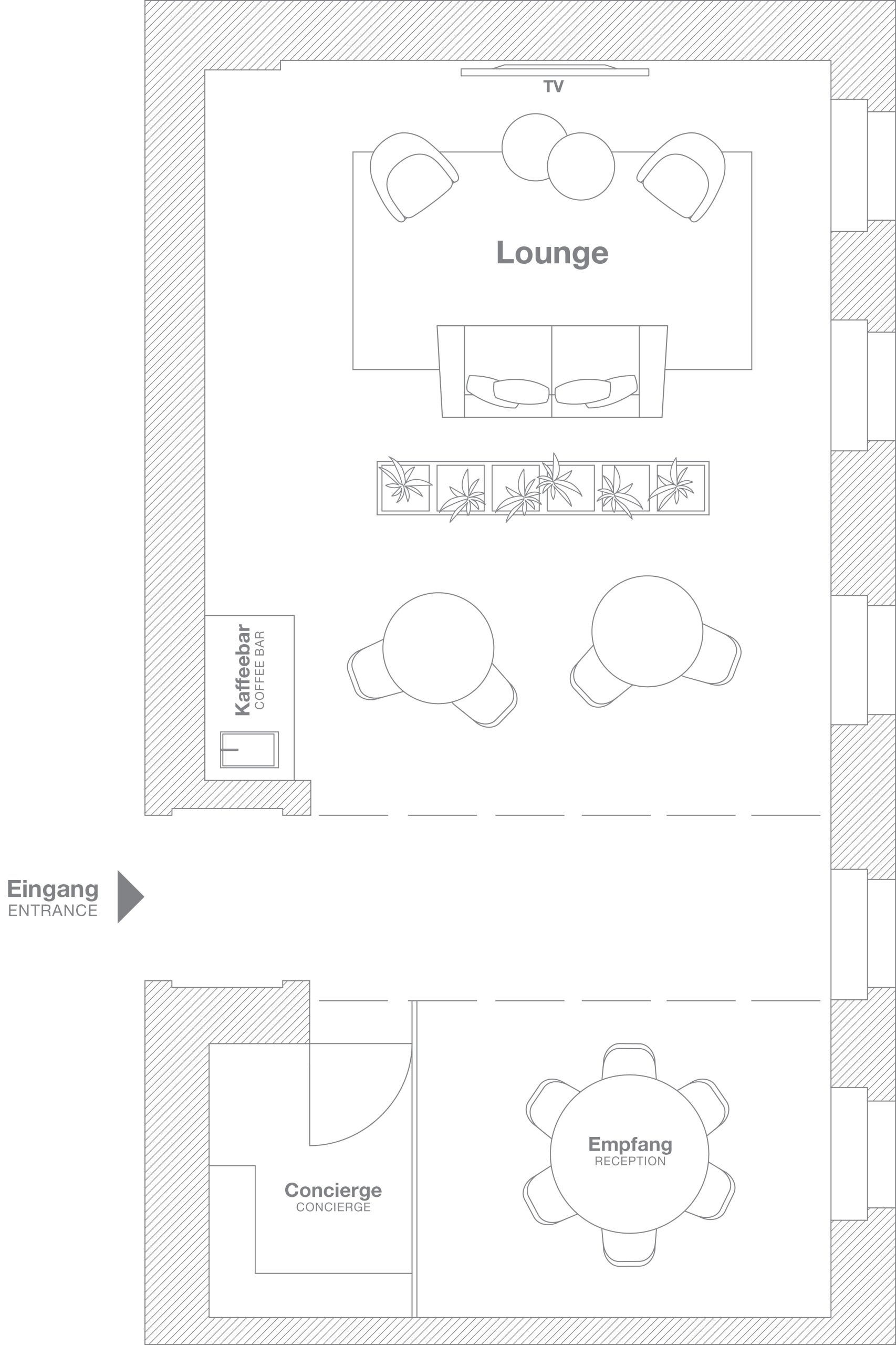 Wir verbinden den Komfort deines ipartments mit dem Service eines Hotels. Genau dafür ist die Lounge im EG gedacht. Optimal für Coworking, ein Feierabendbier mit den Nachbarn oder einfach nur zum Entspannen. Die angeschlossene Terrasse mit Blick auf die begrünte Piazza lädt zum lässigen Verweilen ein. You are welcome!