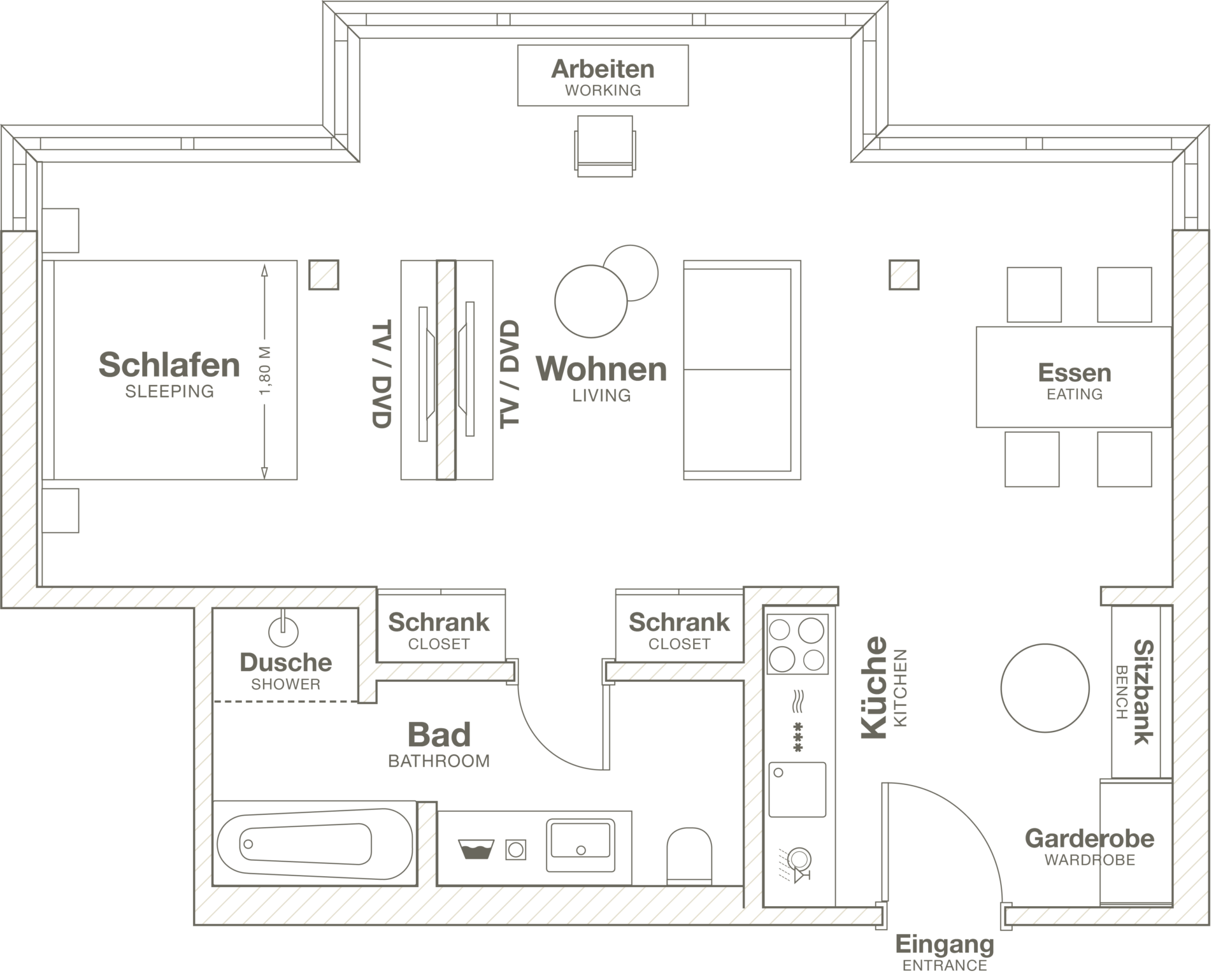 Welcome-Paket, digitale Gästemappe, Concierge-Service, 24/7 Hotline, Nebenkosten, Strom, WiFi, Sat-TV, Basisservice (Putz- und Wäscheservice alle 14 Tage) und 7% MwSt incl.