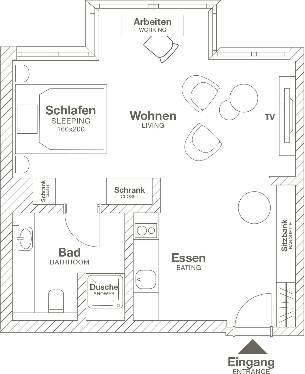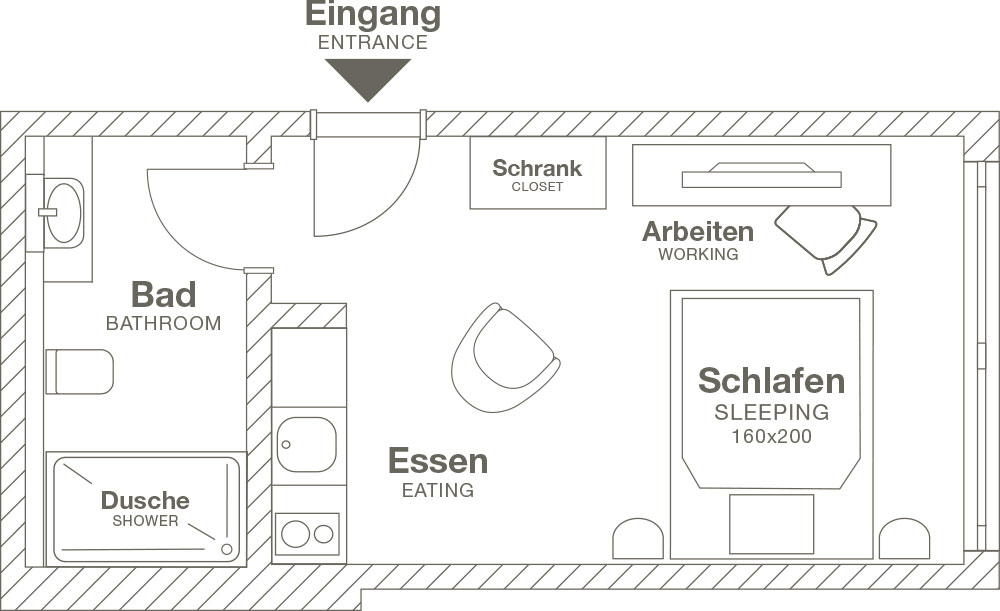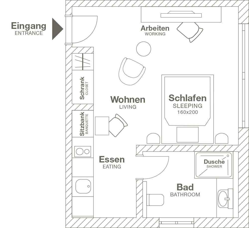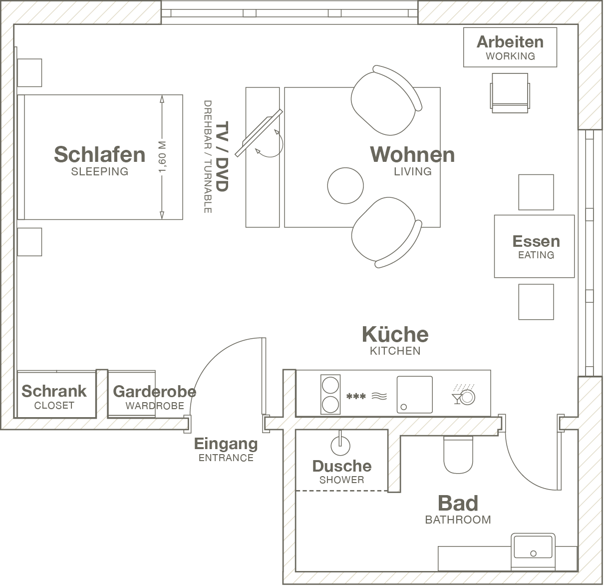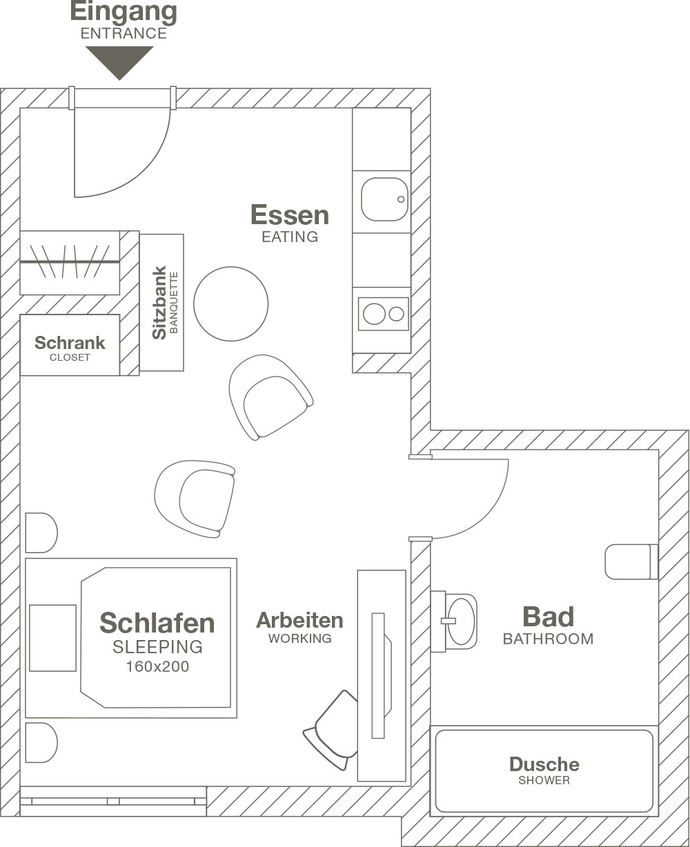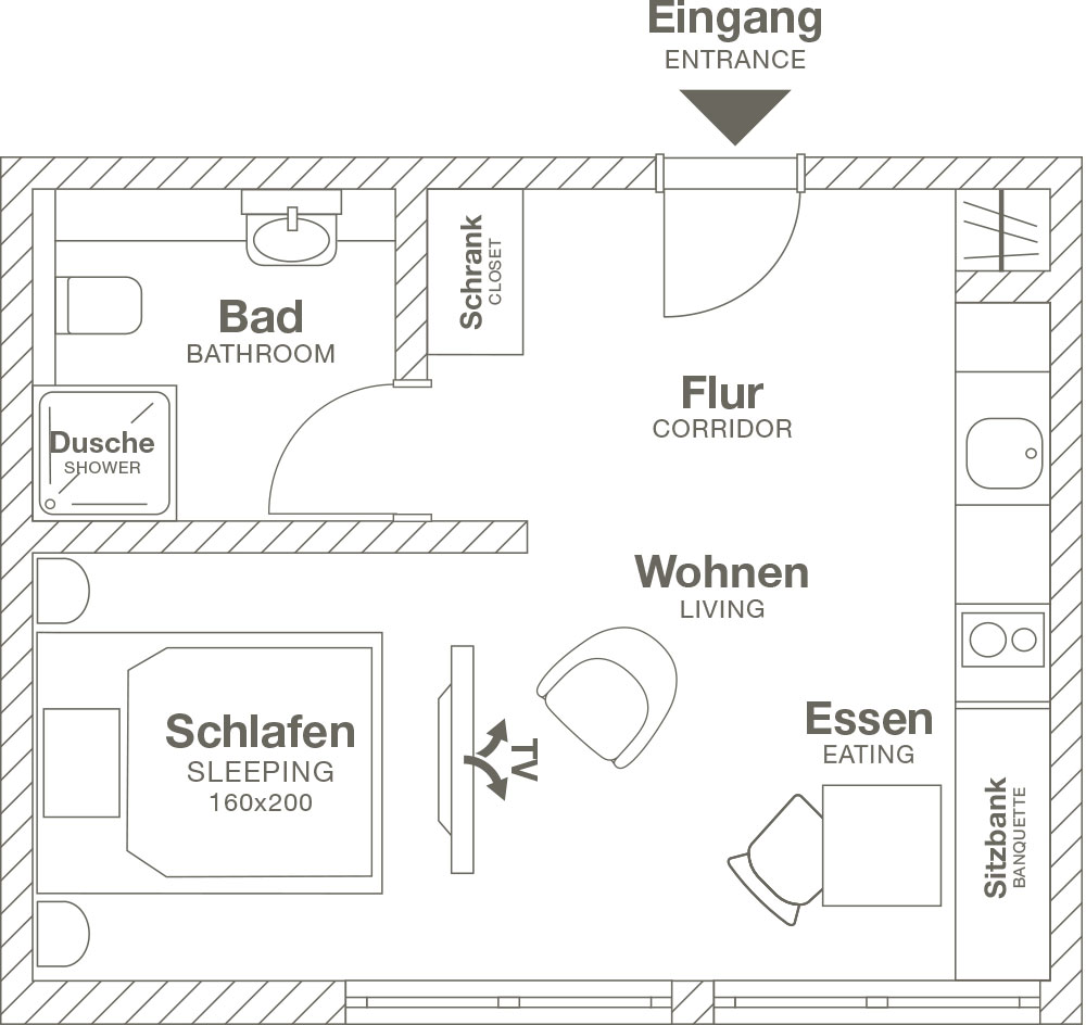 Ca. 22 qm // KOMPAKT, ABER VOLLSTÄNDIG AUSGESTATTET: OPTIMAL FÜR ALLE, DIE ALLEINE UNTERWEGS SIND